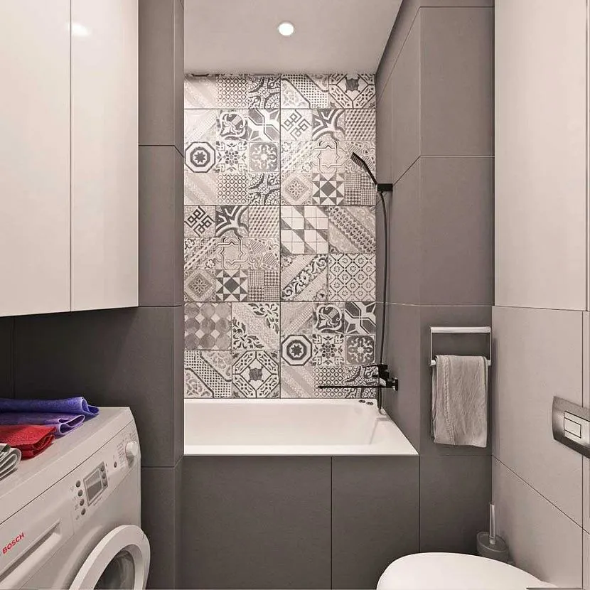 Ванная меньше трёх метров без туалета. Мест хранения хватит благодаря большому узкому шкафу слева от раковины. Он в правильном цвете(белый глянец). Благодаря цвету не выглядит громоздким, хотя очень вместителен. На ванне складная стеклянная шторка и штанга для душевой лейки — можно принимать душ даже стоя и не залить ванную. Цвета плитки бежевый и серый, затирка правильного серого цвета. На части 1 стены сделан акцент ненавящевым узором — на 1 стене допустимо. Тумба подвесная — удобно убирать, не занимает пол.
