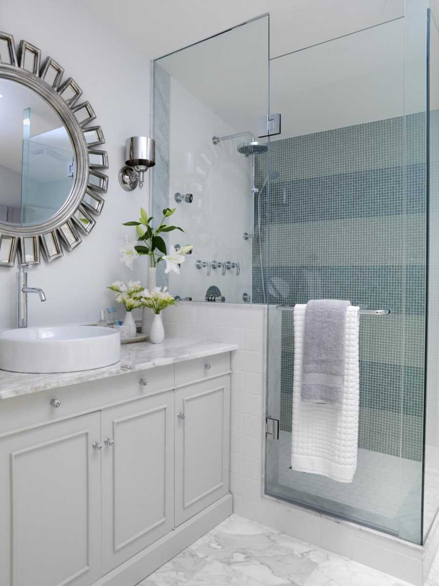 Если места для ванны катастрофически не хватает, а вы, к тому же, не любитель плескаться в теплой водичке, есть резон задуматься о душевом боксе. Или уголке — кому что ближе. Они обычно размещаются в углу — это позволит сэкономить пространство.