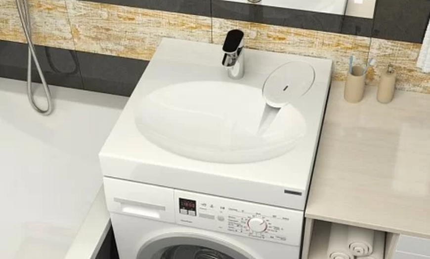 Под раковиной. В этом случае необходима узкая машинка с фронтальной загрузкой.