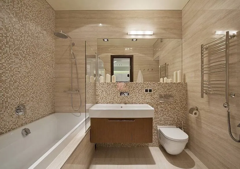 Наилучший выбор дизайна для маленькой ванной, в которой требуется уместить туалет и душевую кабину. В отличие от более строго хай-тека с холодной цветовой гаммой и обилием металла, для минимализма можно использовать более тёплые цвета — бежевый, кофейный, карамель.