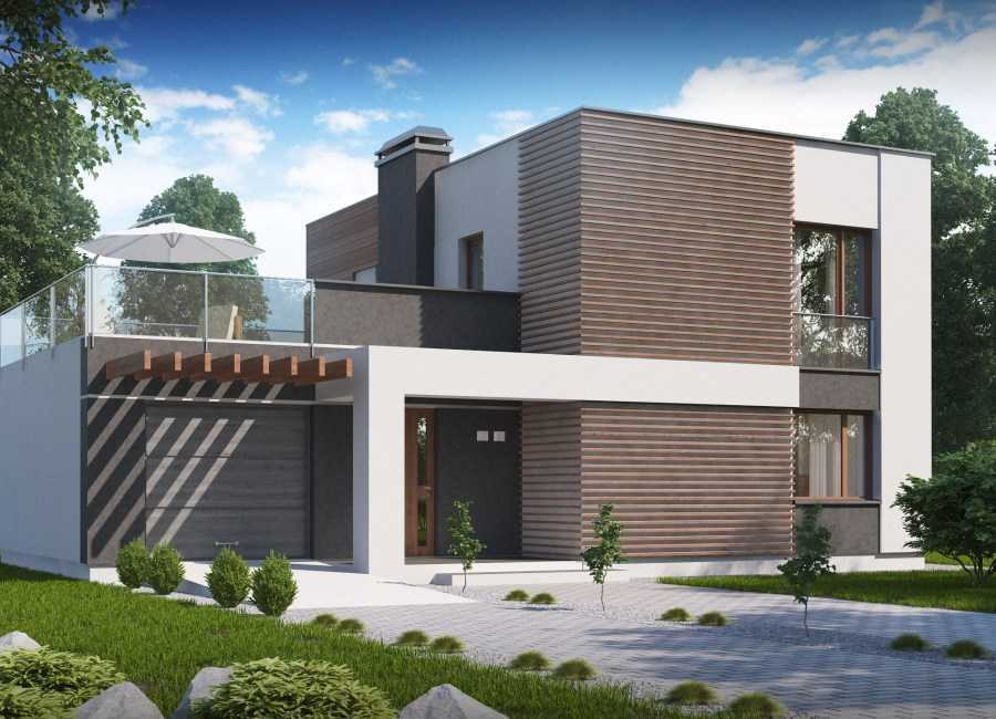 Для современных блочных коттеджей используются легкие и практичные керамзитобетонные и газобетонные блоки. По своей сути теплый и универсальный материал хорошо вписывается в концепцию течения. А снаружи такой можно обшить деревянной вагонкой или сайдингом.