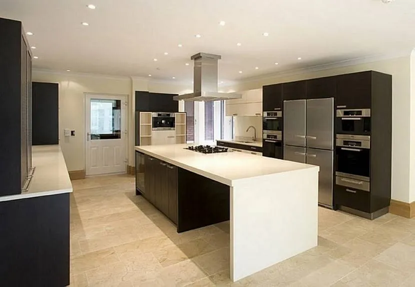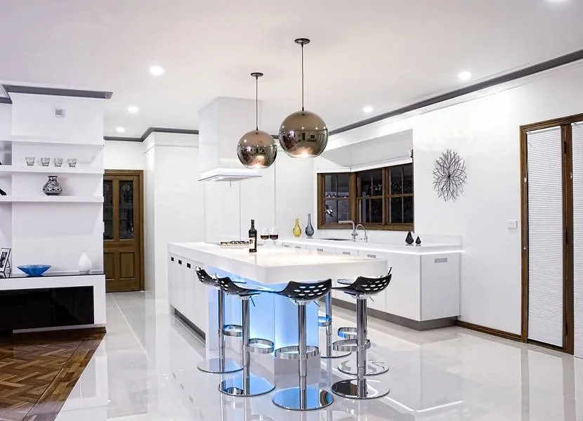 Кухня. Идеальное место для воссоздания оригинального дизайна. Стильная обстановка достигается использованием износостойких высокотехнологичных материалов; предпочтение отдается пластику, алюминию, стеклу, нержавеющей стали. Эталон стиля — комната со специальной модульной мебелью и со всей требуемой техникой; удачный ход — использование акцентной светодиодной подсветки.