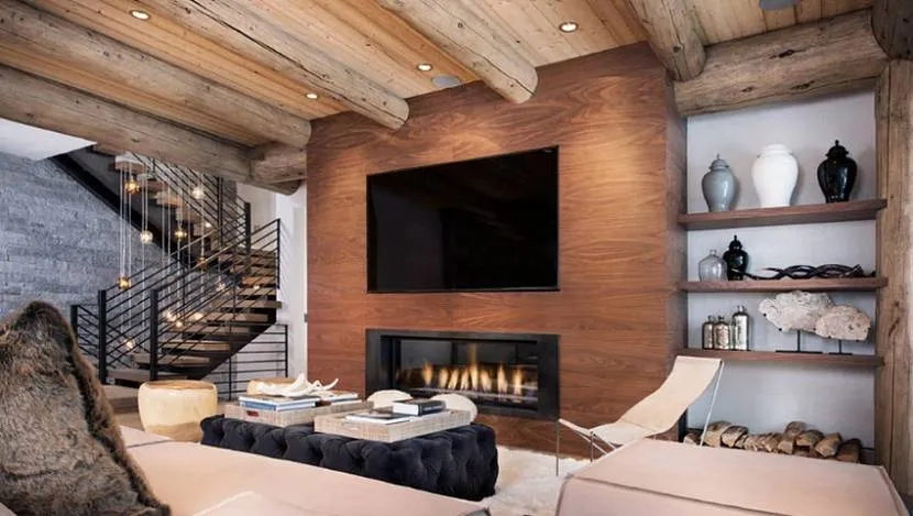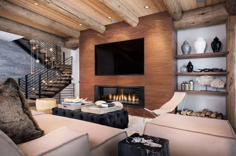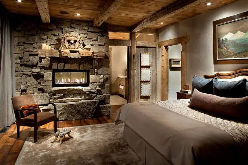 Камин — визитная карточка стиля, место фокусировки интерьера. Он устанавливается в гостиной, а то и в спальне, облицовывается камнем. Встречаются электрические камины, над которыми вполне естественно выглядят плазменные телевизоры.