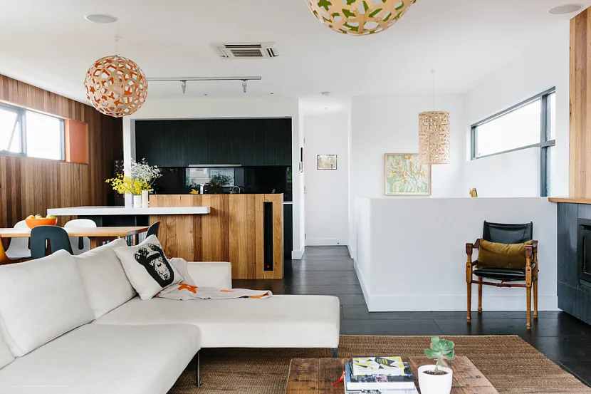 Раздвижные двери дают возможность одновременно проводить время в кругу семьи и следить за готовкой на кухне. Можно разделить пространство, используя разное напольное покрытие и другие элементы.