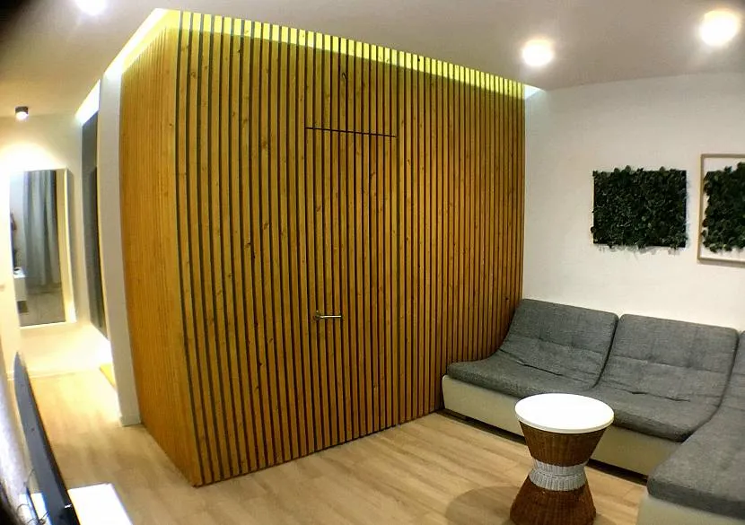 В просторном помещении допустимо устанавливать двери с любым механизмом открытия. В небольшой комнате стоит отдать предпочтение раздвижной двери.