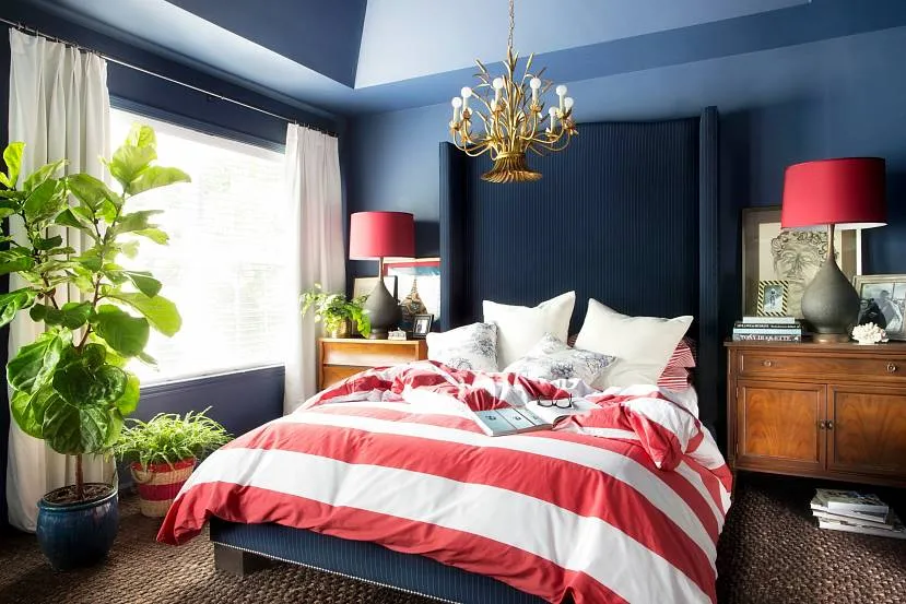 Красный вместе с синим смотрится изысканно и жизнерадостно. Такое сочетание подойдет для спальни в морском стиле.