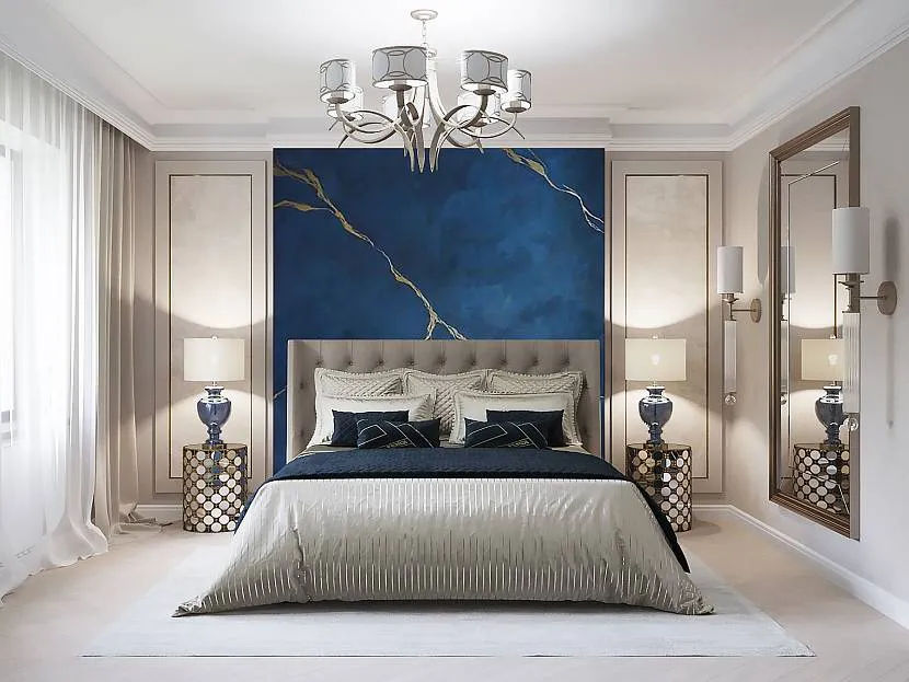 Оформление спальни в голубых и золотистых тонахИсточник remontbp.com