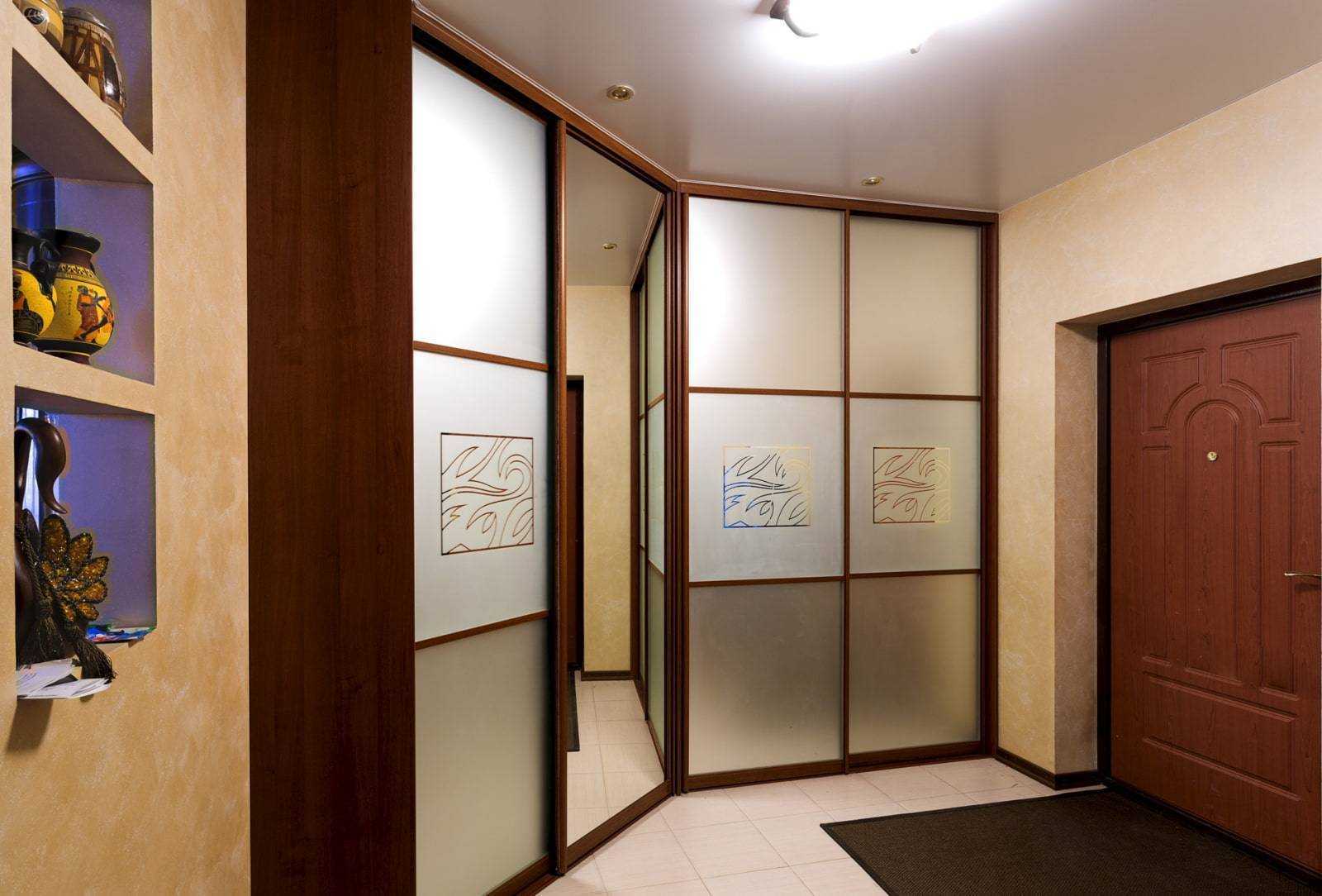 На фото угловой гардероб со стеклянным матовым фасадом, украшенным рисунками.