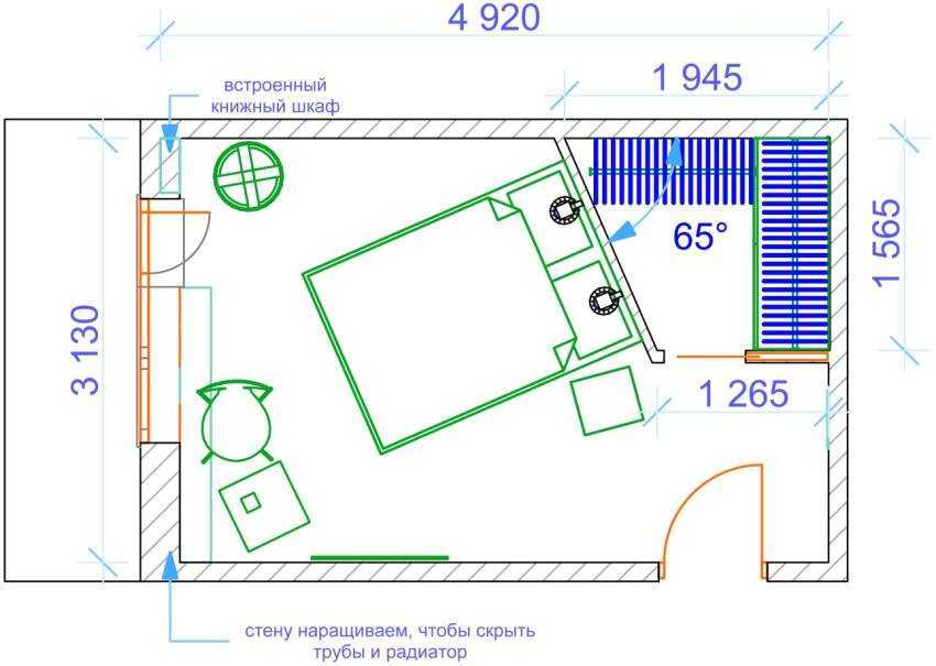Планировка спальни с угловой гардеробной