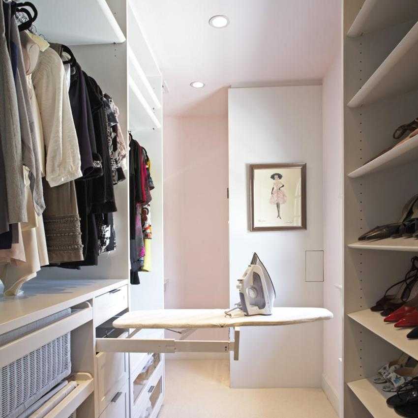 - Гладильная доска. В сложенном состоянии гладильная доска остается полностью незаметной, так как обычно ее прячут в нишу или узкий шкафчик в одной из секций гардеробной. Для такого дополнительного элемента требуется продумать расположение розетки, и выбрать место в котором можно будет разместить утюг с учетом правил безопасности.