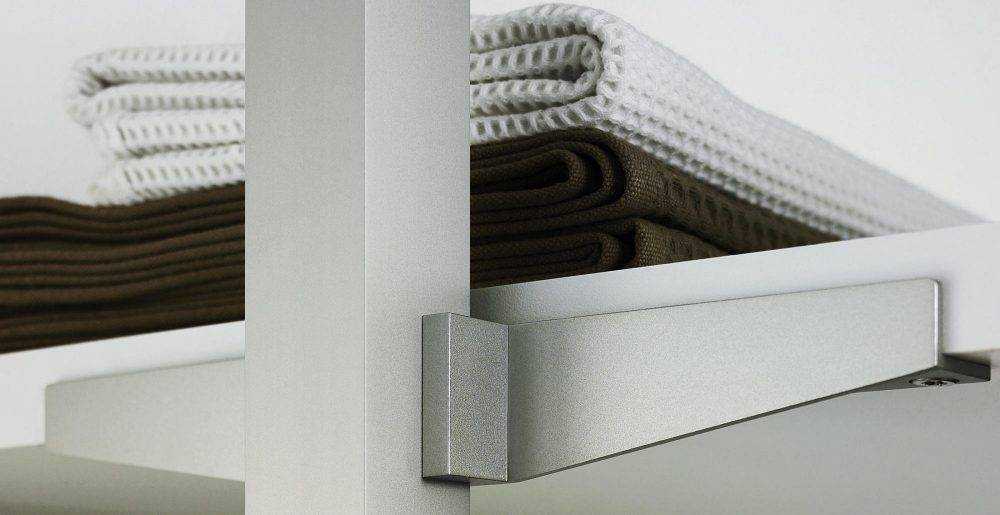 Крепится к металлическим стойкам в пазы, а на него уже садятся элементы гардеробной — полки, корзины, выдвижные ящики, брючницы и т. д.