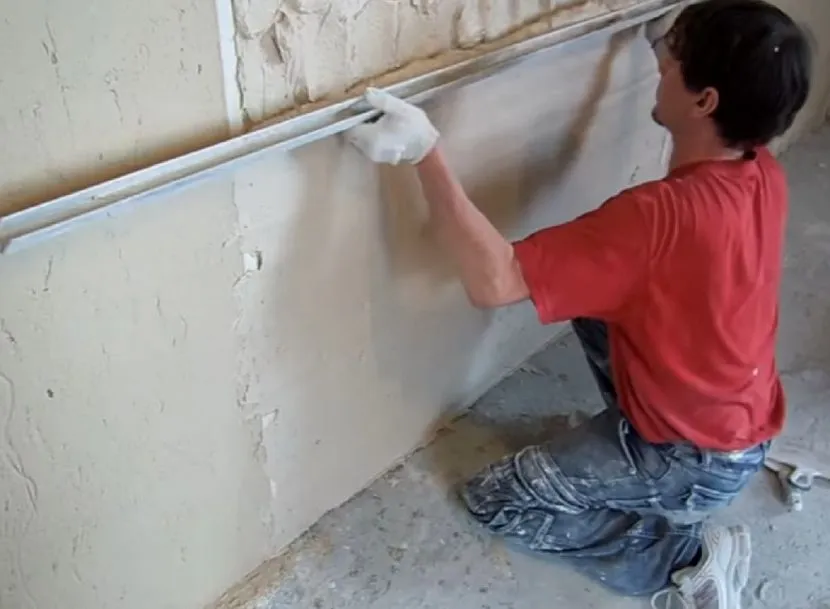 На всю высоту поверхности устанавливают маяки. Ширина между деталями должна быть меньше характеристик правила на 30 см. При выравнивании профессионал перемещает конструкцию в форме зигзага, траектория которого выходит за пределы деталей.
