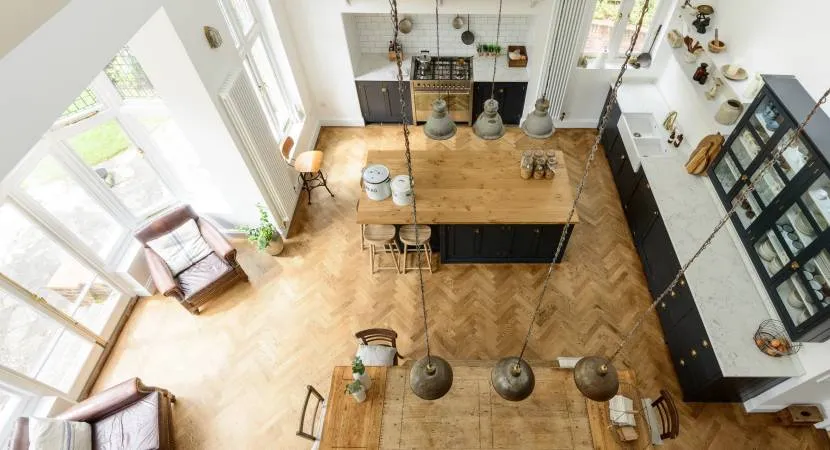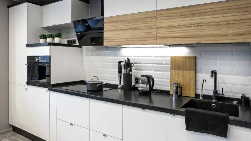 Кухня, как и ванная, является помещением с периодическими изменениями температуры и влажности. Эта особенность накладывает ограничения на выбор отделочных материалов: они должны быть влагоустойчивыми, паропроницаемыми, справляться со скачками температуры и не бояться бытовой химии.