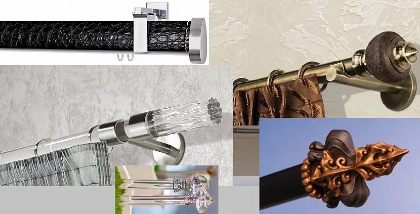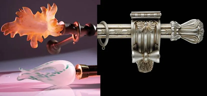 Крепежные элементы штор, а также различный декор штор должны выполняться в одном дизайне с наконечниками и самой штангой.