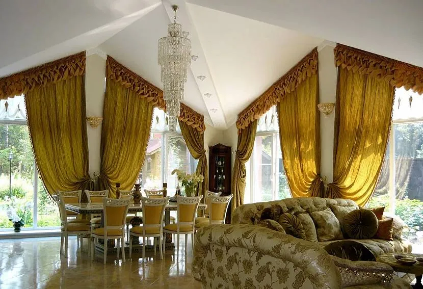 Так как карнизы на треугольные окна расположены под наклоном, мягкие шторы не будут держаться в верхней части проема, и будут съезжать. Как правильно закрепить шторы на треугольном окне, чтобы они надежно крепились, создавали красивую композицию и служили украшением интерьера?