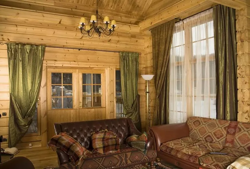 Зеленые шторы в деревянном домеИсточник horosho-doma.ru