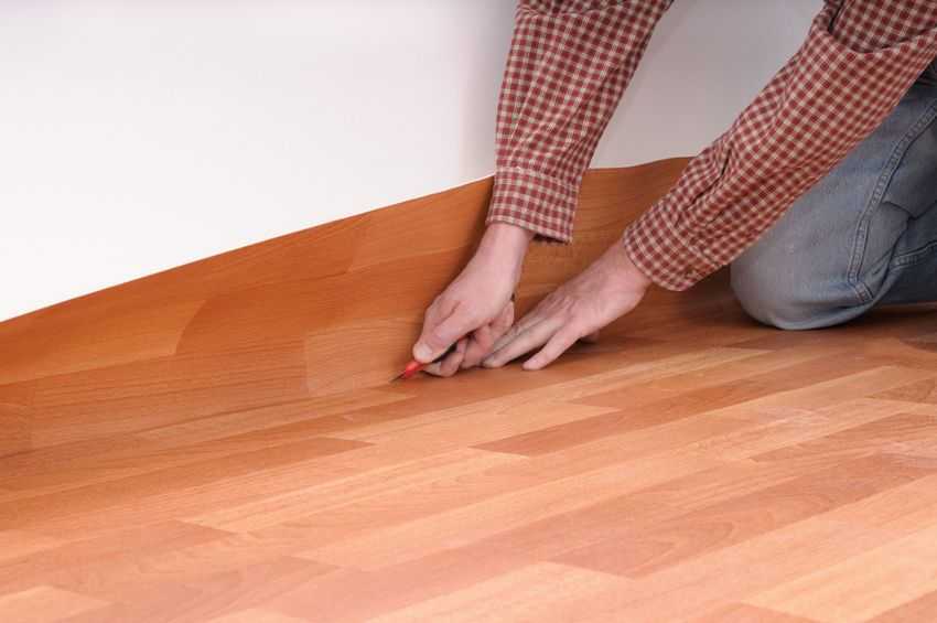 Линолеум разворачивают и оставляют еще на некоторое время для выравнивания. После этого его обрезают, для чего необходимо использовать специальный, очень острый строительный нож. С его помощью резать материал довольно легко, сделать ровные надрезы поможет разметка на обратной стороне вдоль и поперек. Не стоит забывать о технологических зазорах, которые между покрытием и стеной должны составлять не менее 5 мм.