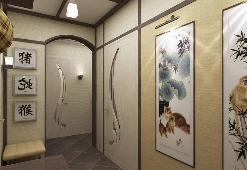При оформлении коридора желательно отдавать предпочтение миролюбивым сюжетам: архитектурным пейзажам или декоративной живописи, иллюстрациям растений или животных, макросъемке или минимализму — всё это будет оптимальным решением для прихожей.
