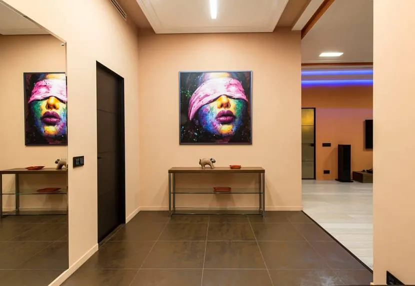 В прихожей необходимо поддерживать пропорциональное соотношение между её размерами и величиной картины. В тесном помещении не будут смотреться массивные полотна, они подойдут только для просторных коридоров. А в свободном пространстве неуместными будут миниатюрные картинки. Не стоит превращать прихожую в музей: для оформления лучше использовать не более 5 полотен.