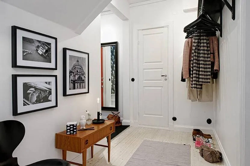 На фото коридор в скандинавском стиле с небольшими черно-белыми картинками на стене.