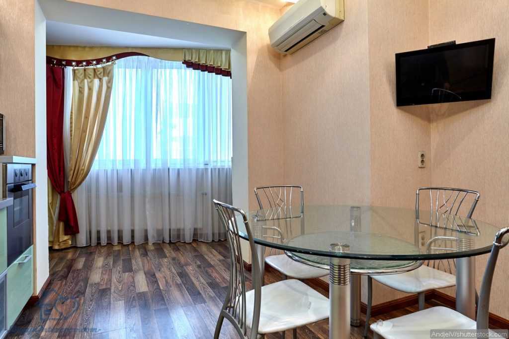 Для самых маленьких кухонь можно посоветовать складной стол, который прикручивают к подоконнику или стене. Когда настает время приятия пищи, его поднимают, а после – возвращают в привычное положение, чтобы он не мешал свободному передвижению по кухне. Как правило, вместе с такими столами используют табуретки, которые также можно сложить, или установить друг на друга.