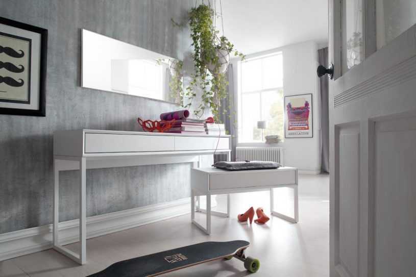 Консоль представляет собой небольшого размера столик, стоящий на четырех ножках, один конец его примыкает к стене. Традиционно узкий консольный столик в прихожую используется как подставка под зеркальные поверхности, но вполне может выступать в качестве самостоятельного элемента – например, места для хранения предметов декора и памятных вещей. Обычно приобретаются такие конструкции для классических интерьеров.