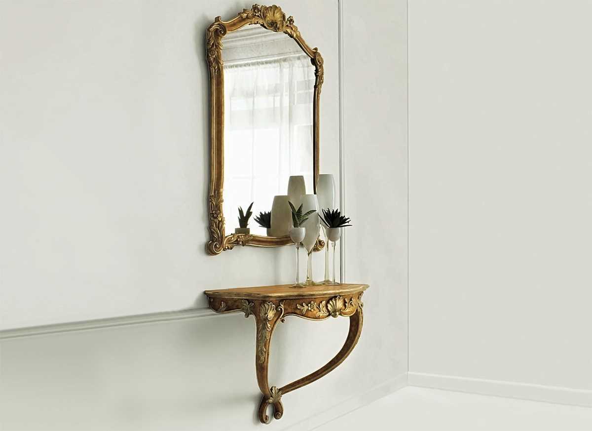 Консольные столы с овальным зеркалом исключительно хорошо проявляют себя в классическом интерьере. Такие решения следует основательно декорировать — выложить мозаикой, расписать или выполнить верх из природного камня с отменными декоративными свойствами. Когда на первом месте соображения экономии пространства, откидной тип оказывается одним из лучших. Он может быть как квадратным, так и полукруглым — инженеры и дизайнеры давно освоили оба эти варианта и умеют мастерски применять их.