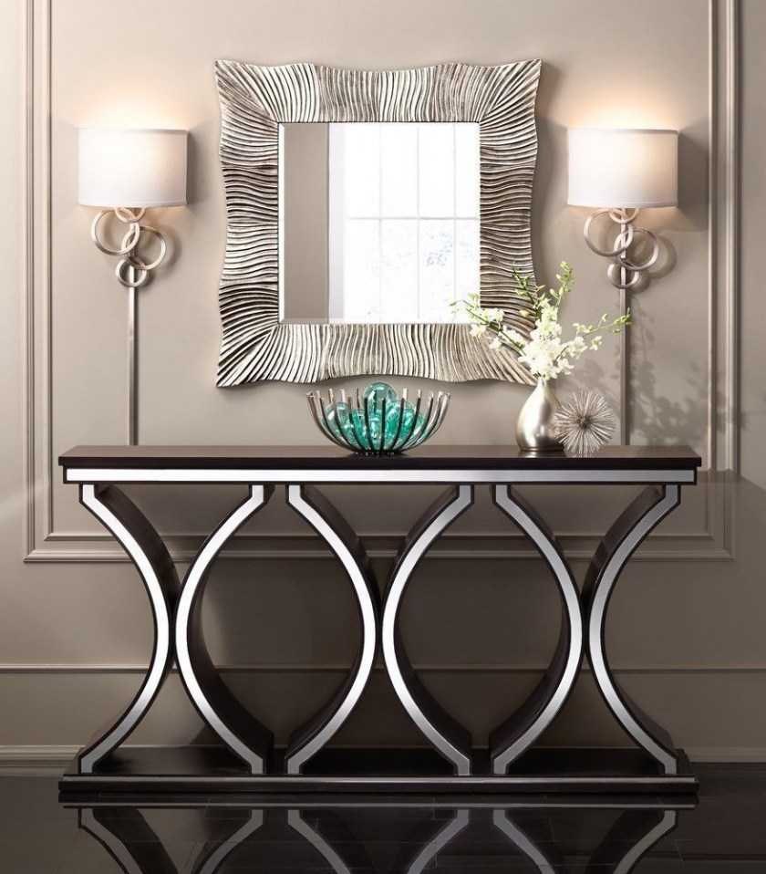 Чтобы консоль органично вписывалась в интерьер прихожей, ее можно дополнить зеркалом, картиной, табуретом или парой стульев, а над уровнем столешницы расположить 1-2 светильника (настольных или настенных). Такое обрамление добавит помещению уют, сделает его более комфортным.