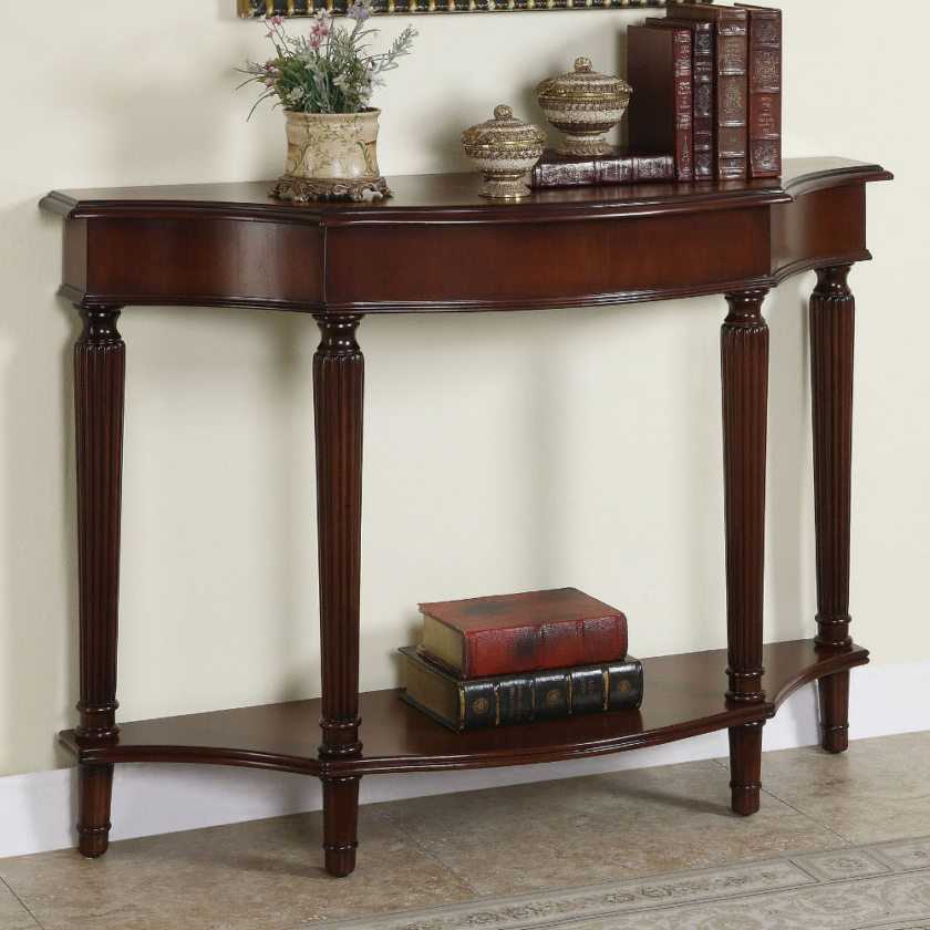 - Для классических интерьеров приобретают пристенные модели с изящными ножками. Изделие должно быть изготовлено из ценной породы дерева, иметь богатую фактуру и оттенок. Такая мебель служит элементом декора. Максимум, что можно на нее поставить — это вазу или хрупкую статуэтку.