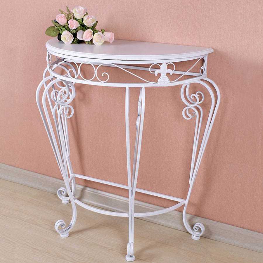 Металла. Модели из этого материала можно встретить в урбанистических стилях. Они выглядят эффектно и подчеркивают стилистику интерьера. Отдельная разновидность — кованые консоли, окрашенные в белый цвет. Такие модели будут уместны в интерьерах стилей прованс и шебби-шик. Недостаток металла — его значительный вес, консоли из него стоит выбирать отдельно стоящие.