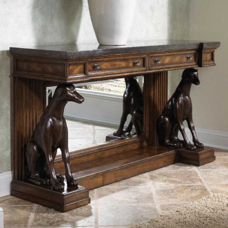Предпочтительны консоли, при оформлении которых используется гобелен, позолота, натуральный камень. Кроме всего прочего, оригинально и к месту смотрится консоль с элементами художественной росписи, естественным будет патинирование.