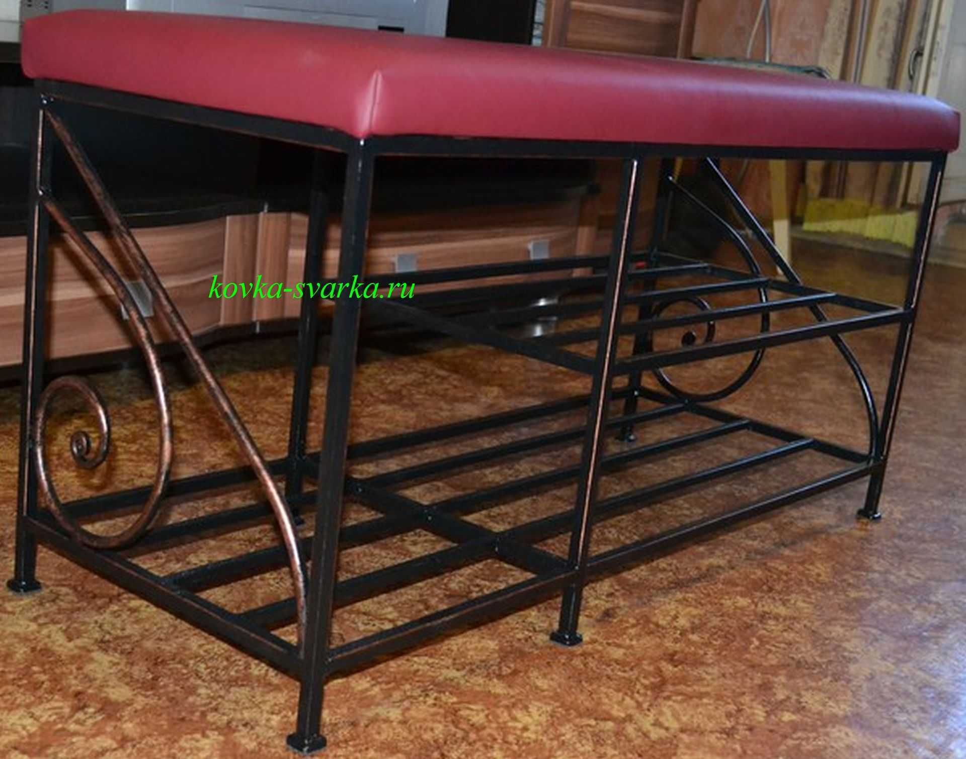 Кованые банкетки в прихожую могут быть выполнены на разный стиль и дизайн. Такого вида банкетка может быть как со спинкой, так и без нее. В качестве обивки используют мягкий текстиль, как правило, такая банкетка не оснащена ящиками для хранения или полочками. Кованая банкетка отлично подойдет для прихожей в стиле барокко или прованс.