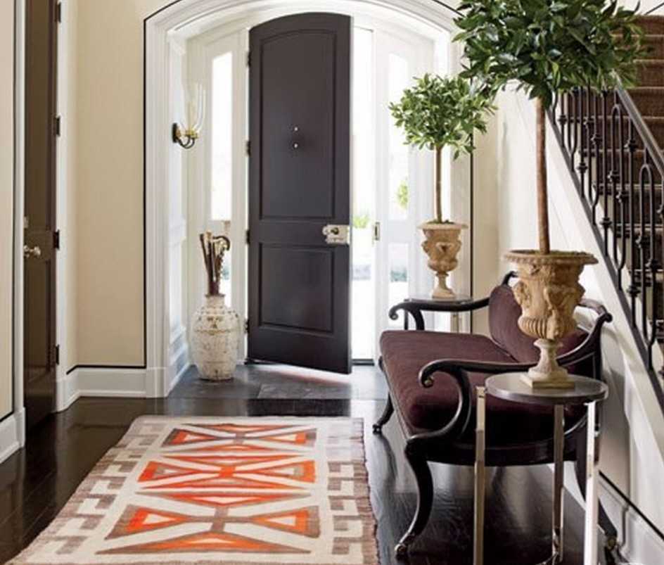 Для гармонии в прихожей важно соблюсти некоторые правила. Если входные двери темных тонов, то ковер в прихожую следует выбрать оранжевого, синего или бежевого цвета