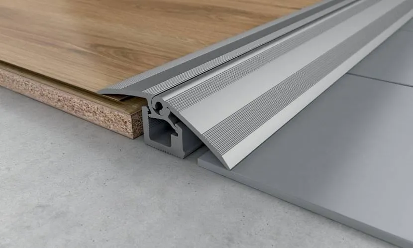 Лучшие шины получаются из алюминиевых сплавов. Но не реже применяется прочный пластик. Декоративную планку делают из металла, МДФ или резины. В паз она заходит тяжело, поэтому понадобится помощь киянки. Такие профили также используют для стыковки не только с ламинатом, но и с линолеумом или ковролином.