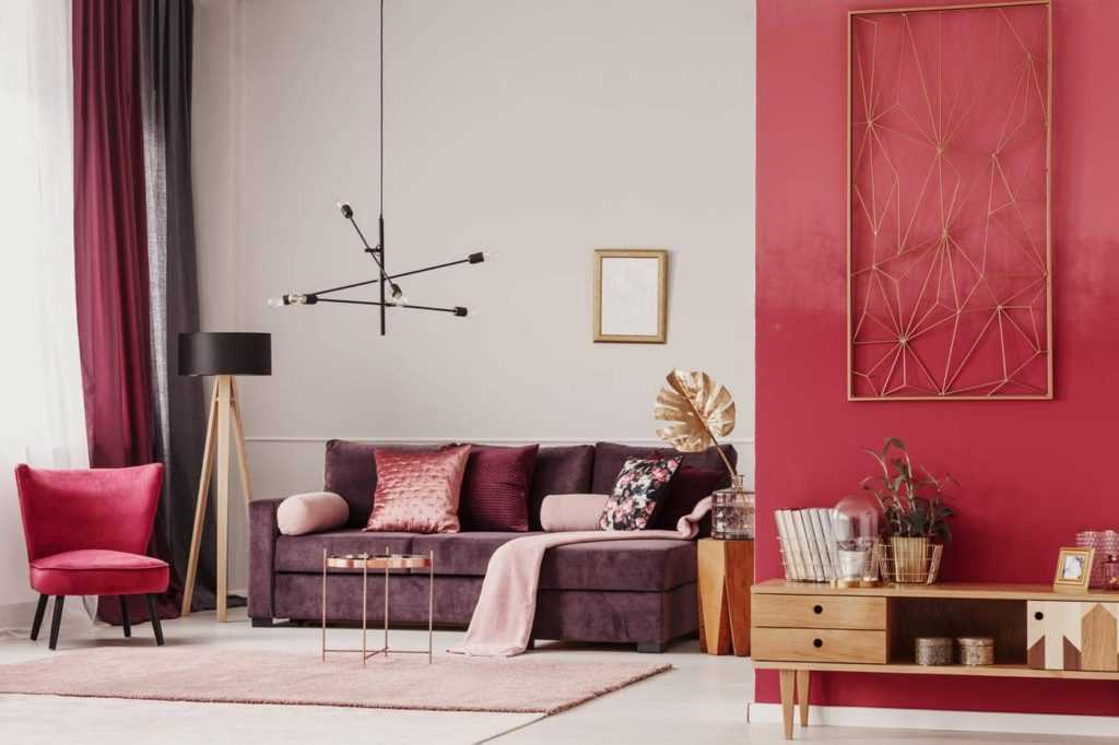 Интерьер может сочетать в себе разные цвета и фактуры. Винный оттенок темно-красного удачно сочетается с серым, образуя строгий и шикарный интерьер. Теплый оттенок красного в комбинации с белым или ярким цветом дарят позитивную энергетику. Стены с абстракцией создают креативный и модный дизайн.