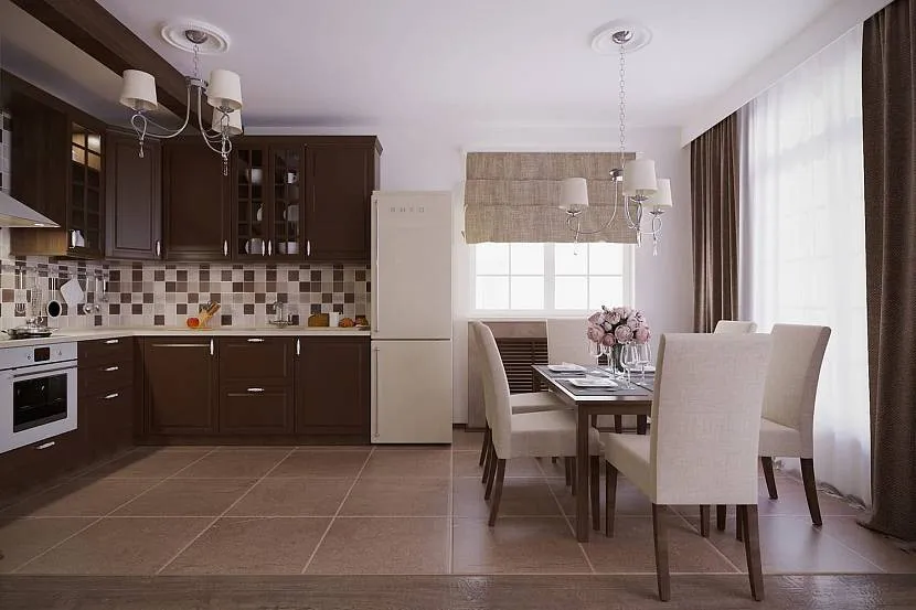 . С помощью напольного покрытия зонирование возможно, но оно будет не так заметно. Если на полу плитка, то для обеденной зоны можно выбрать другой оттенок, чтобы обозначить ее. Как правило, для обеденной зоны выбирают более светлые оттенки, так как она меньше пачкается.