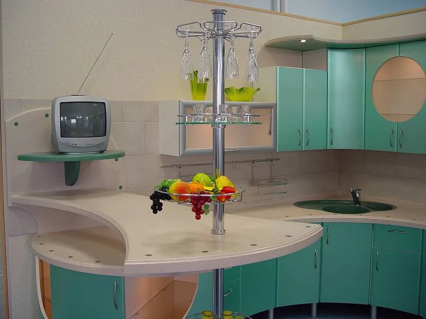 - Границы навесных шкафов и напольных тумб иногда объединяют по бокам системой открытых скругленных полочек.
