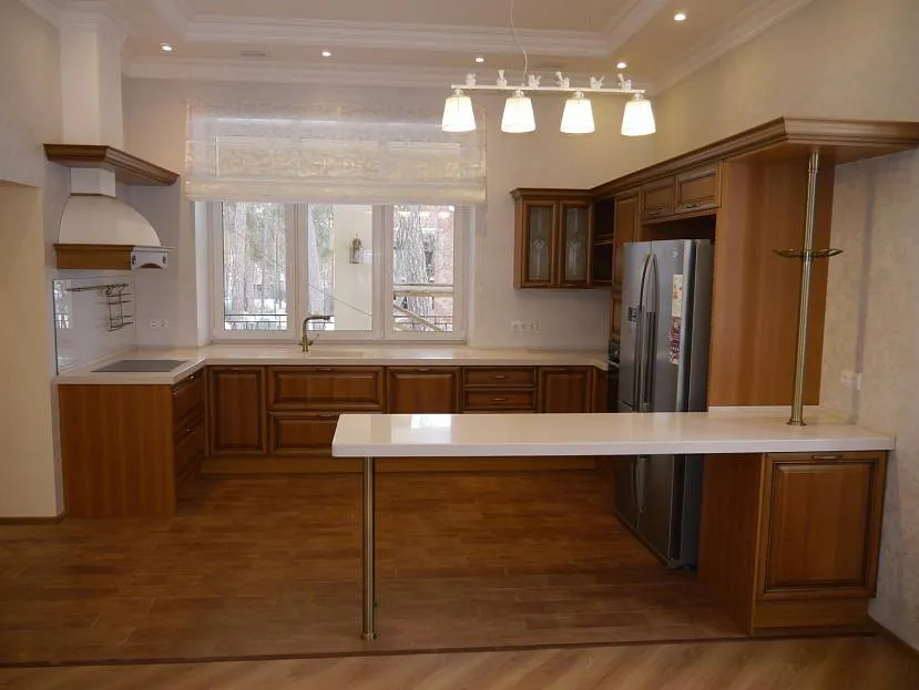 Кухня с барной стойкой и мойкой напротив окна в загородном домеИсточник i1.photo.2gis.com
