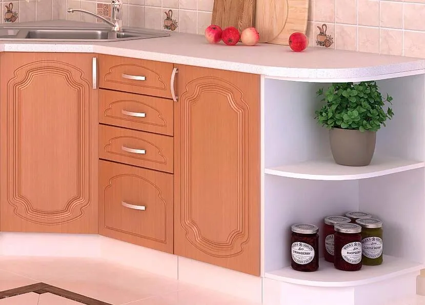 Комплект мебели кухни скруглен, отдельный шкаф заполнет пространство углаИсточник i1.photo.2gis.com