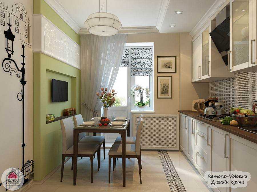 Впрочем, есть и более простой вариант: колонна вплотную к стене. Он подойдет для небольших кухонь, до 12 кв.м., где вы не хотите занимать место декором, совмещенных с маленьким балконом. Поставьте обеденный столик там, где проходила перегородка — просторная столовая готова!