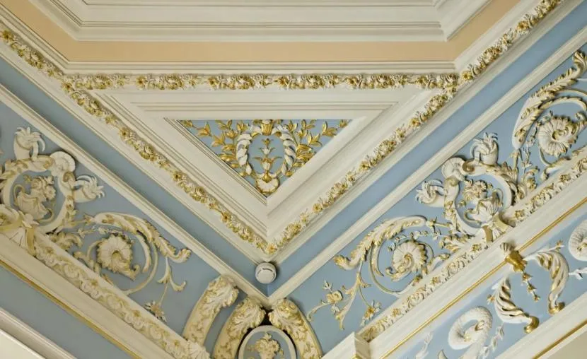 Барокко: для этого дворцового стиля характерна обильная сложная лепнина с фигурными и растительными мотивами, часто позолоченная.