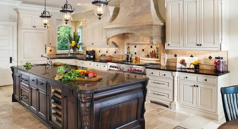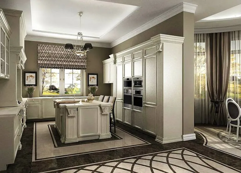 Классика остаётся популярной вне зависимости от модных тенденций. Именно этот стиль символизирует устойчивость традиций, комфортную атмосферу интерьера. Кухонные фасады дополнены рельефными текстурами, серебряным, золотым патинированием. Преобладает спектр бело-бежевых, коричнево-кофейных тонов. Вписываются в стилистику резные детали мебели. Преобладают текстуры окрашенного дерева. Островная часть кухни должна соответствовать этим традициям.