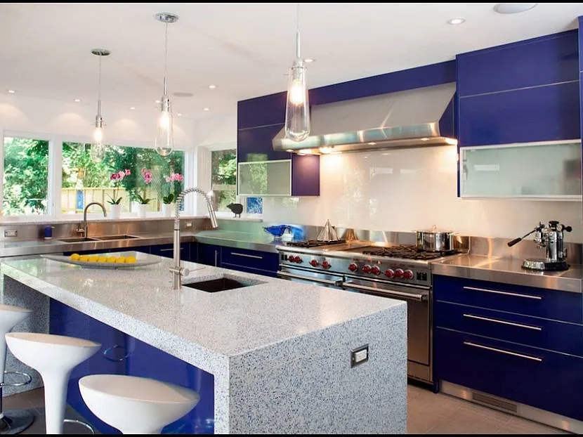 Синий гарнитур на кухне с несколькими источниками освещенияИсточник dizaynkuhni.top