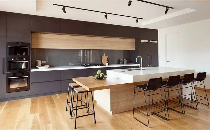 Большая столешница может быть одновременно обеденным столом или барной стойки. За большой столешницей может с комфортом разместиться сразу до 8-12 человек. Также используют различные формы островной конструкции и двухуровневую столешницу.