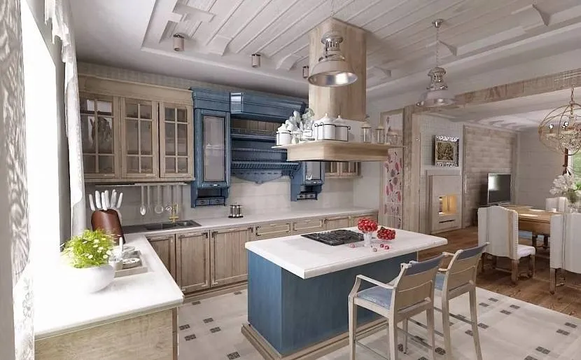 Материалы, детали: дерево; плетёные корзинки вместо выдвижных ящиков; керамическая плитка в стилистике «гжель»; ручки шкафов под «медь»; люстры с абажурами.