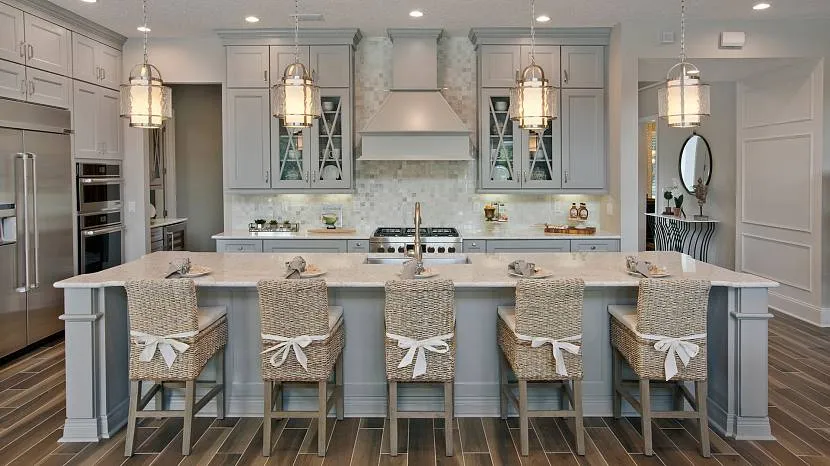 - Если ваша кухня утилитарна, и в доме есть отдельная столовая, то остров может быть большим и играть роль барной стойки для быстрых перекусов. Такое решение подойдет и для совмещенной кухни-гостиной-столовой, ведь островки прекрасно зонируют пространство.