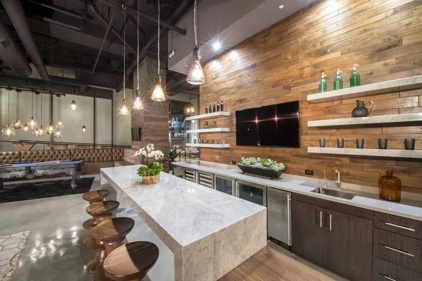 - остров с барной стойкой, который сможет стать дополнительным элементом зонирования. Организовать барную зону можно за счет выступающей с одной стороны столешницы, но по высоте такое решение не будет дотягивать до полноценной барной стойки. Альтернативное решение – приподнять часть столешницы;