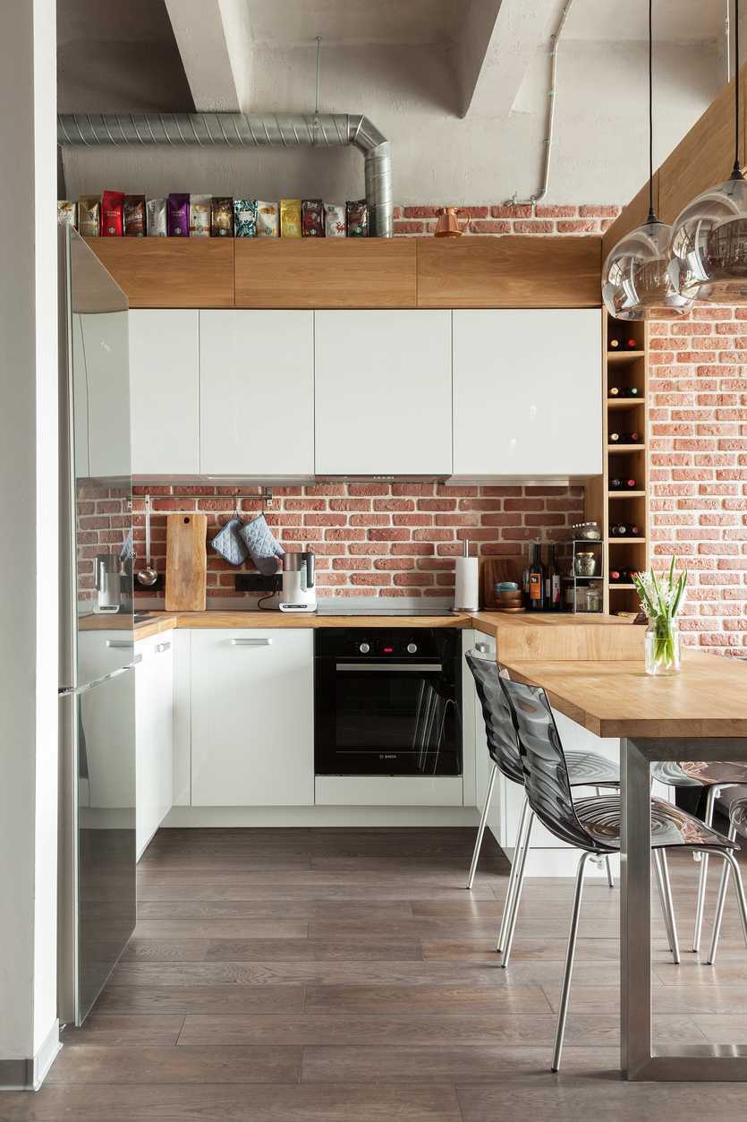 Кирпич: фартук из декоративного кирпича и гарнитур под дерево – идеальная пара для кухни в стиле лофт.