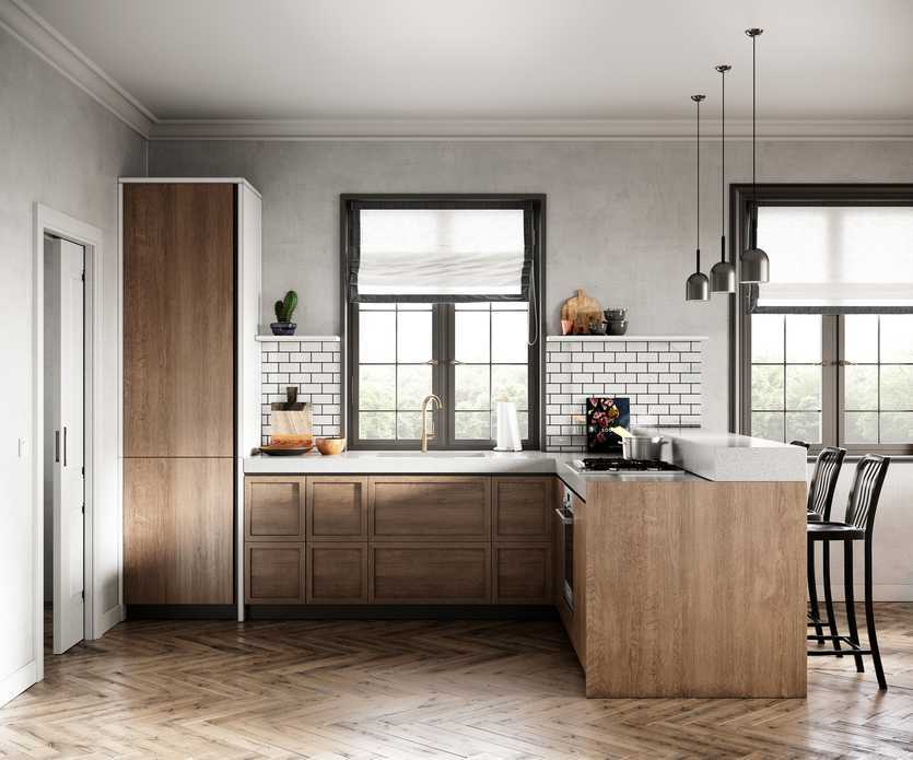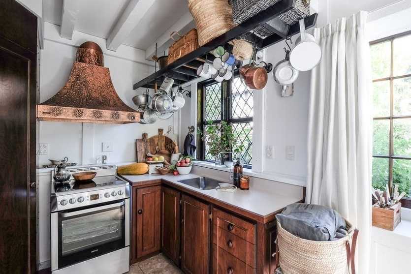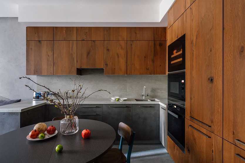 Металл: дерево отлично дружит с металлом – в ручках, на кухонном фартуке и вытяжке.