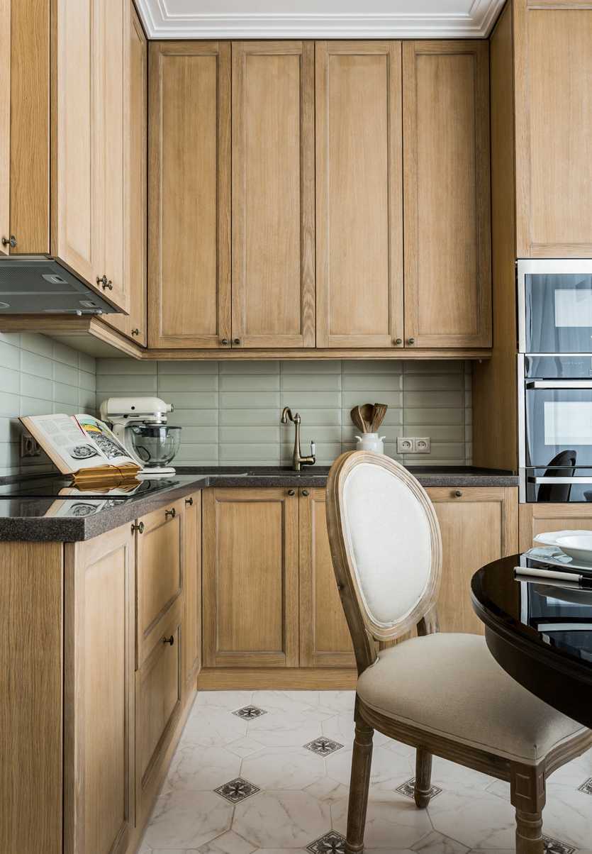 Керамическая плитка: при выборе цвета керамического фартука обращайте внимание на тон дерева на фасадах кухни – они не должны «перебивать» друг друга. Лучше выбрать нейтральные белые, серые цвета